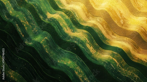 © vadosloginov, Obraz premium Expansive farmland viewed from above showcasing vibrant green and golden waves of crops during daytime