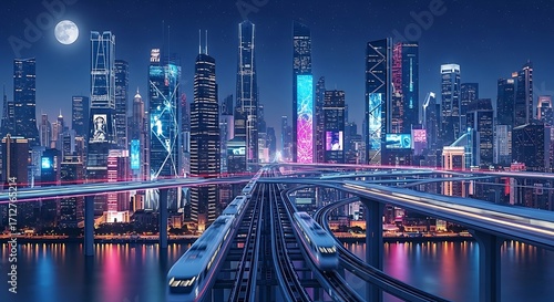 © Nayan, Obraz premium Expansive Futuristic City with Elevated Transit Systems and Water Reflections Keywords: futuristic city, cityscape, night, neon lights, skyscrapers, urban, transportation, technology, modern