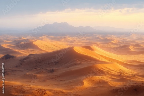 © btiger, Naklejka premium Expansive golden sand dunes under soft sunlight with distant mountain range and hazy sky creating a serene desert landscape