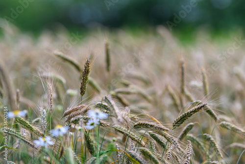 Obraz premium Expansive Golden Wheat Field Abloom with Vibrant Wildflowers Amidst a...