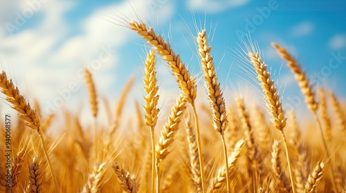 Fototapeta premium Expansive golden wheat field with a bright blue sky perfect for...