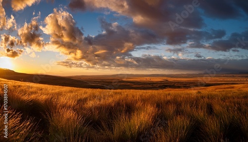 © Jasmyn, Obraz premium Expansive Grassland Scenery Beneath A Stunning Cloudscape During Golden Hour