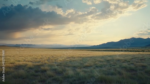Fototapeta premium Expansive Grasslands and Dramatic Sky at Sunset in the Countryside