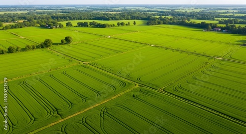 © Onisevens, Fototapeta premium Expansive Green Farmland Aerial View with Patterned Fields, Showcasing Sustainable Agriculture and the Beauty of Rural Landscapes in Sunlight