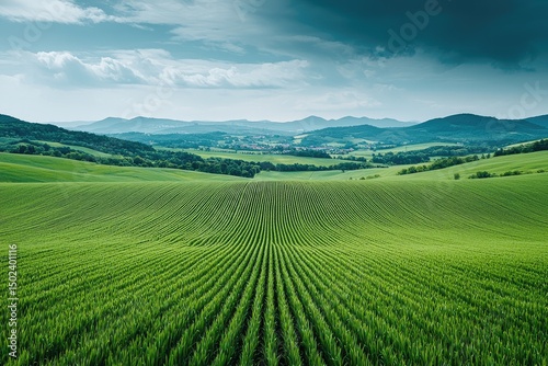 © jenk, Naklejka premium Expansive green field landscape stretching to distant hills.