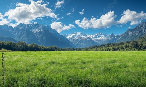 © dia, Fototapeta premium Expansive green field leading to snow capped mountains under a partly cloudy blue sky landscape view