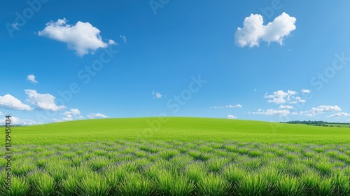 Fototapeta premium Expansive green field meets beautiful blue sky with clouds