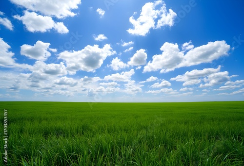 © ERWIN, Obraz premium Expansive green field stretches towards the horizon under a bright blue sky filled with fluffy white clouds.