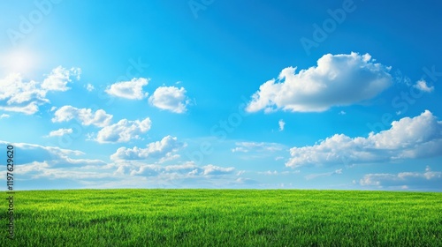 Obraz premium Expansive green field under a bright blue sky with fluffy clouds on a sunny...