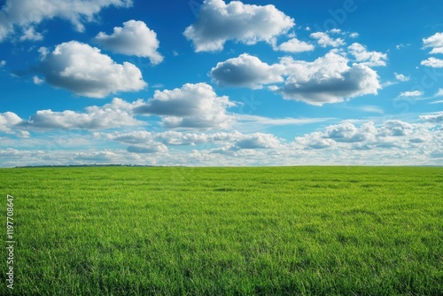 Naklejka premium Expansive green field under a bright blue sky with fluffy clouds providing a...