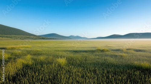 Fototapeta premium Expansive Green Field Under A Clear Blue Sky With Distant Hills And Atmospheric Perspective