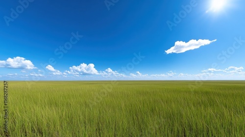 Fototapeta premium Expansive green field under a clear blue sky with fluffy clouds.