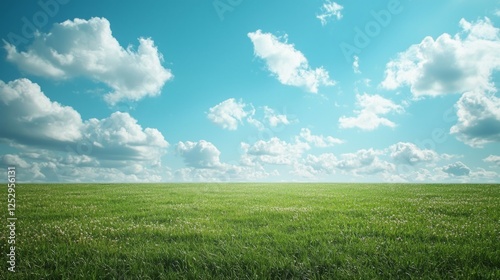 © Kitta Studio, Fototapeta premium Expansive Green Field Under Bright Blue Sky with Fluffy Clouds