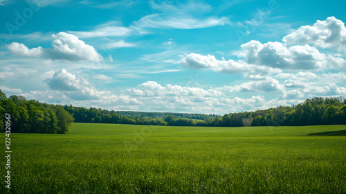 © Generative AI, Fototapeta premium Expansive Green Field Underneath a Blue Sky Filled With Fluffy Clouds : Generative AI