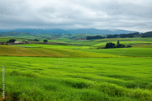 © Nature_Beauty, Obraz premium Expansive green fields stretching under a cloudy sky