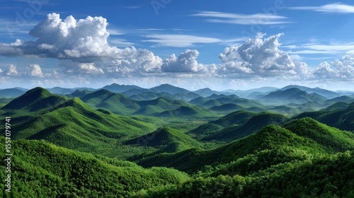 © wannakorn, Obraz premium Expansive Green Hills Under a Bright Blue Sky with Fluffy White Clouds in a Natural Landscape