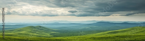 © Manita, Obraz premium Expansive green hills under a cloudy sky, showcasing natural beauty.