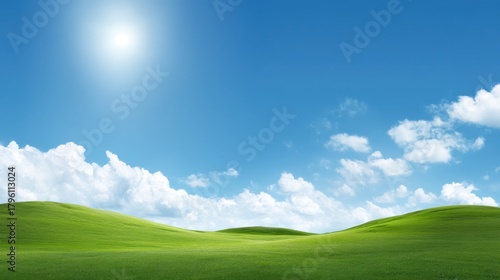 Fototapeta premium Expansive Green Landscape Under Bright Blue Sky with Soft White Clouds and Radiant Sunlight Illuminating a Serene Natural Environment