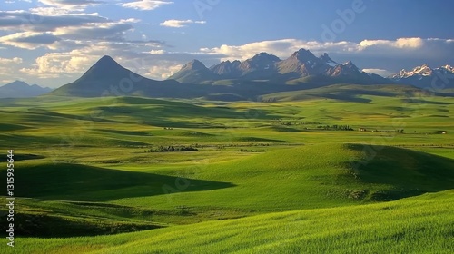 Fototapeta premium Expansive Green Landscape with Rolling Hills and Majestic Mountains Under a...
