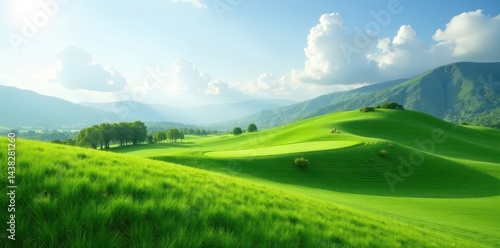 © sawaratch, Obraz premium Expansive green lawn slopes to low stone wall , texture, landscaping