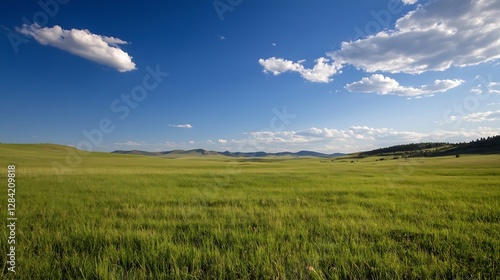 © Generative AI, Obraz premium Expansive Green Meadow Under a Bright Blue Sky with Fluffy White Clouds in the Background : Generative AI
