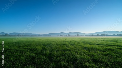 Fototapeta premium Expansive green meadow with clear blue sky and distant mountains at sunrise
