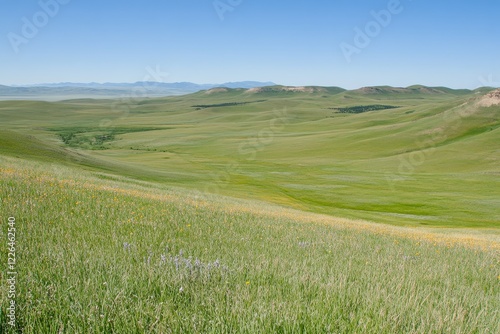 Fototapeta premium Expansive Green Prairie Landscape Under Clear Blue Sky
