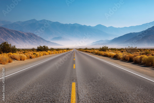 © Slepitssskaya, Fototapeta premium Expansive highway stretches through arid landscape with mountains and clear blue sky in background