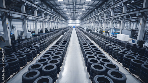 Fototapeta premium Expansive Industrial Warehouse Storing Tires in Organized Shelving System