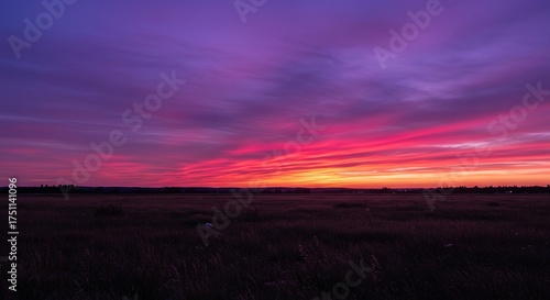 © methinee, Fototapeta premium Expansive landscape bathed in the ethereal glow of a mesmerizing purple and pink twilight sky, evoking a sense of wonder and tranquility ,ethereal ,atmosphere ,twilight