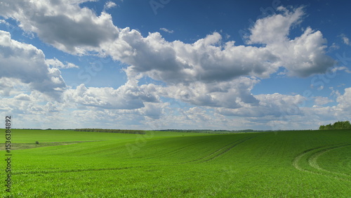 © beholdereye, Fototapeta premium Expansive Lush Green Fields Spread Under a Bright and Beautiful Sky Filled with Clouds Time lapse.