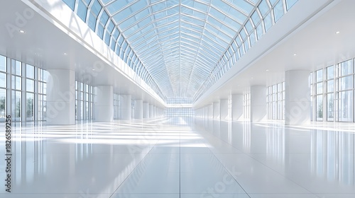 © pkproject, Fototapeta premium Expansive modern architectural interior featuring a vaulted glass ceiling large and a gleaming reflective white floor creating an open and airy atmosphere