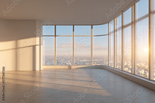 Obraz premium Expansive modern interior space offers panoramic city views through large curved windows during sunrise or sunset