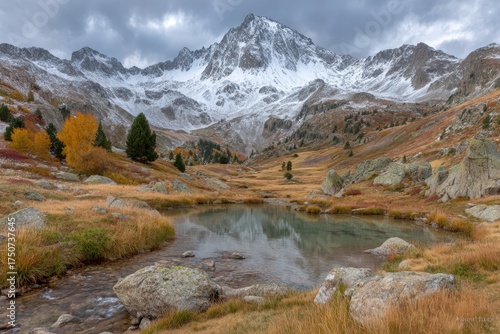 Fototapeta premium Expansive mountain landscape showcasing autumn foliage and tranquil lake reflecting snow-capped peaks under dramatic cloud formations creating an enchanting natural setting