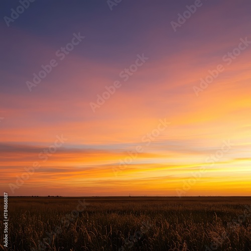 Obraz premium Expansive natural background featuring the vibrant meeting of warm sunset colors across a vast, endless landscape and open sky ,outdoor ,tranquil ,dramatic