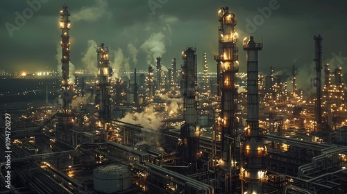 Fototapeta premium Expansive Night View of Modern Oil Refinery with Glowing Lights