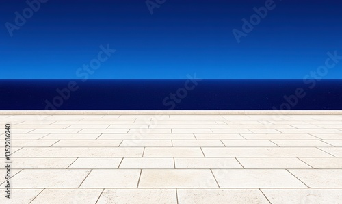 Fototapeta premium Expansive Ocean View with Clear Blue Sky and Tiled Terrace, Ideal for Relaxation and Tranquil Seaside Retreat, Perfect for Travel and Leisure Themes