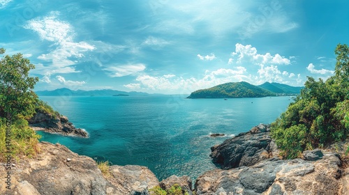 © Rahmat, Fototapeta premium Expansive ocean vista from a rocky promontory.