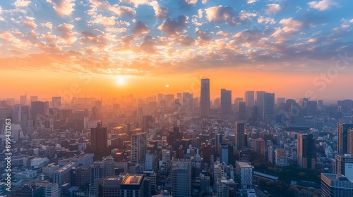 © BG_Illustrations, Fototapeta premium Expansive Panoramic View of Bustling City Under Cloudy Skies