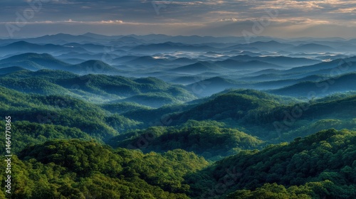 © flow art 7, Fototapeta premium Expansive Panoramic Vista of Rolling Hills in a Dense Forest Landscape with Layers of Greenery and Distant Mountain Ranges