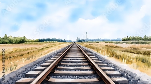 © pkproject, Obraz premium Expansive Railway Tracks Receding into the Watercolor Landscape