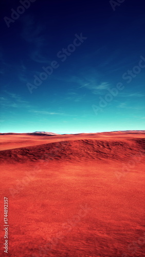 Naklejka premium Expansive red desert stretches out, meeting a clear blue sky. Distant mountains rise gently, creating a serene and captivating natural scene. The colors blend harmoniously, evoking peacefulness.