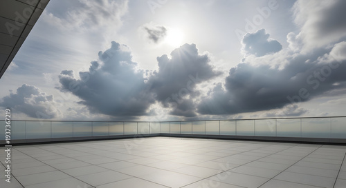 © Lucianastudio, Obraz premium Expansive rooftop terrace with modern glass railings overlooking a dramatic cloudy sky and distant horizon, bathed in sunlight