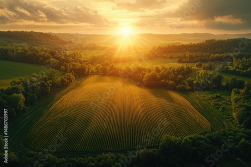 © Rena, Obraz premium Expansive rural landscape at golden sunset.