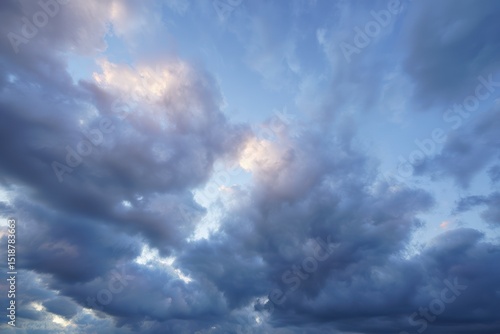 Obraz premium Expansive sky filled with dramatic, dark storm clouds partially illuminated by soft sunlight during dusk or dawn