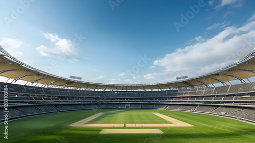 © Telrkmark, Fototapeta premium Expansive Sports Stadium Exterior With Green Field Clear Blue Sky And Cloudy Background