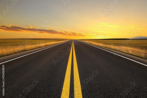 Naklejka premium Expansive Straight Road Under Dramatic Sunset Sky Surrounded by Open Fields...