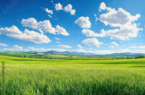 Fototapeta premium Expansive sunlit green meadow with rolling hills under a vibrant blue sky dotted with fluffy white clouds, evoking calm, peace and wide open serenity