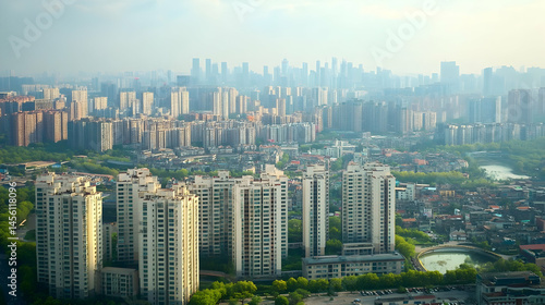 © Aurora Putri, Naklejka premium Expansive Urban Panorama: Dense Apartment Blocks in a Developing Cityscape