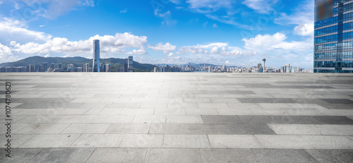 © zhouyilu, Fototapeta premium Expansive Urban Skyline with Dramatic Clouds and Modern Architecture